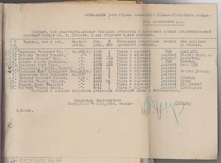 В марте 1943 года вместе с другими рабочими завода Маврикий Карманов подал заявление на вступление в УДТК