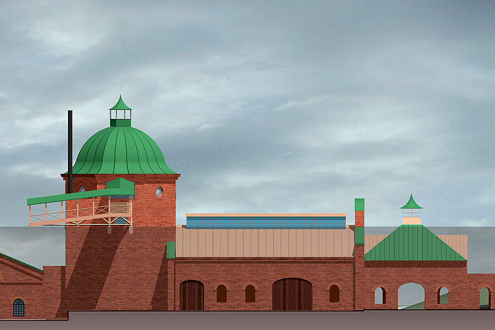 — Фасады Северской домны, увенчанные характерным «барочным» куполом, выполнены в стиле классицизма, характерном для большинства заводских построек XIX века, будь то частные или государственные предприятия. Облик объекта прост и понятен — «восьмерик на четверике»: квадратный объем переходит в восьмиугольный, повторяя схему деревянного зодчества, пришедшую из строительной традиции северных регионов нашей страны. Такая композиция была удобна для возведения высоких культовых сооружений, поэтому она получила широкое распространение в России, включая храмовую и промышленную архитектуру.