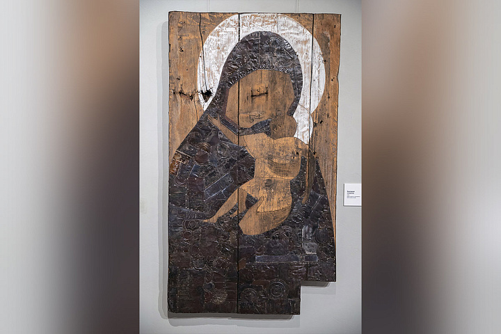 Особое место в экспозиции заняли объемные работы – ассамбляжи. Это техника визуального искусства, где художник использовал детали или целые предметы. Они сформировали серию под названием «Собирательный образ». Разделочная доска, скалка, наличник окна, корпусы музыкальных инструментов – бытовые предметы, утратившие прежнюю функцию, приобрели смысловую нагрузку. В этом цикле важную роль сыграло изображение Богородицы, которую Алексей Чернышов представил в виде обобщенного образа женщины-матери. Одна из ярких работ автора отсылает к Владимирской иконе Божией Матери, сделанной из обожженных консервных банок, кусков железа и гвоздей. Автор подчеркнул, что эти материалы напоминают стиль меднолитых икон, особенно почитаемых на Руси и в старообрядческой традиции.