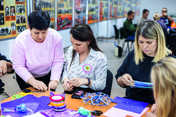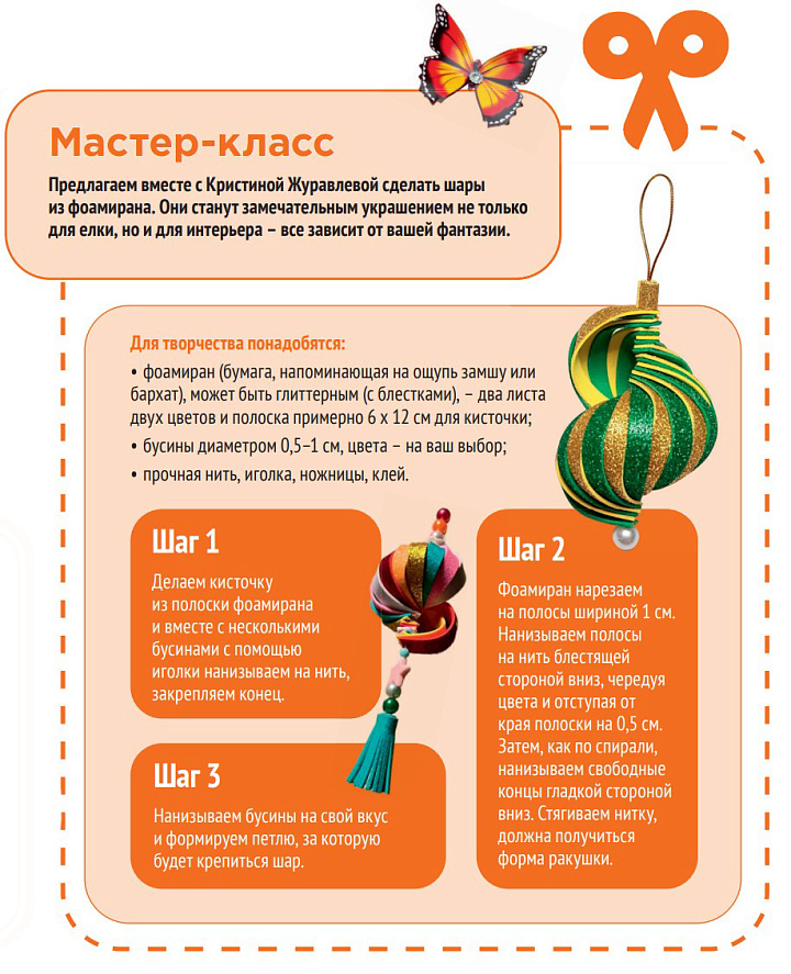 Кристина Журавлева с удовольствием делится секретами мастерства. Благодаря акции «Щедрый вторник» она провела урок для сотрудников Синарского трубного завода, которые вместе с ней создали елочные игрушки из блестящей бумаги и бусин. Рукотворные шары стали нарядом для лесной красавицы в детском социально-реабилитационном центре.